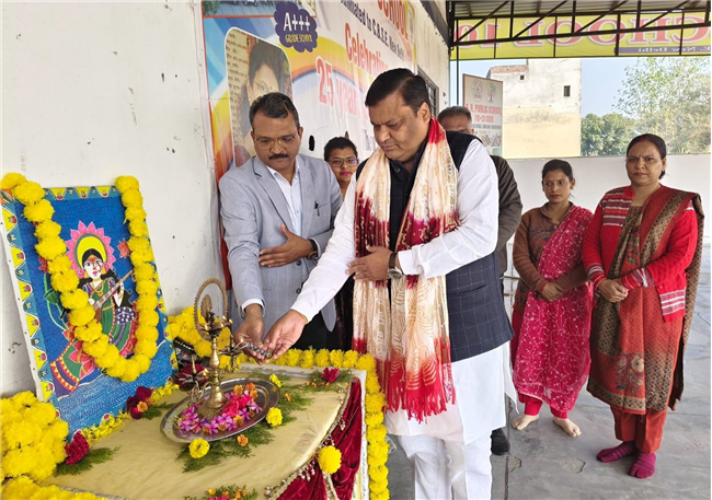 The program began with the lighting of the ceremonial lamp and offering of floral tributes to Baba Saheb Dr. Bhimrao Ambedkar by the school manager Mr. Gopal Agarwal, Director Mrs. Meenakshi Agarwal, Principal Mr. Aneesh Kumar Singhal, and the esteemed guest and social worker Mr. Sachin Agarwal.
